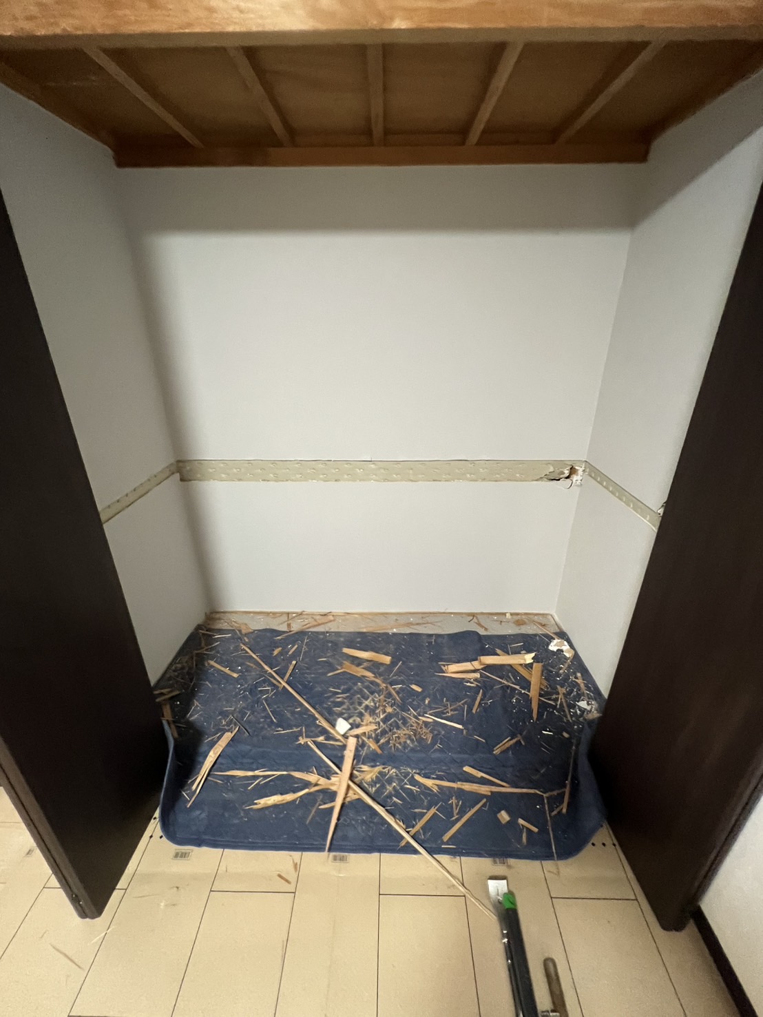 2026-02-16 住宅(戸建) 内装 大東市深野にて中古住宅を購入したのですが、クローゼットの中に和室押入だった名残の 中段があって使いにくい。服をかけやすいようにハンガーパイプをつけてほしいと、ご依頼がありました。 一覧に戻る